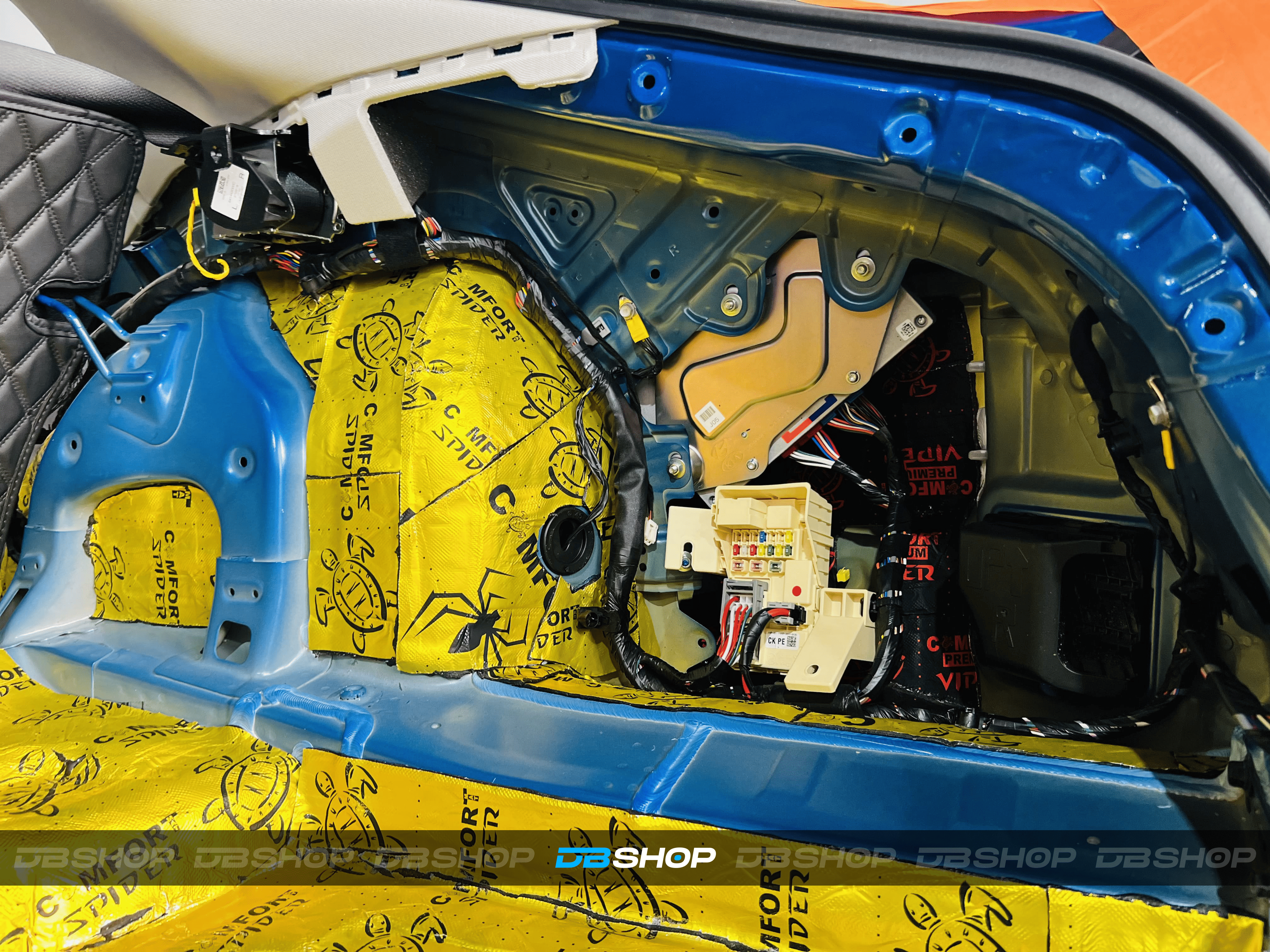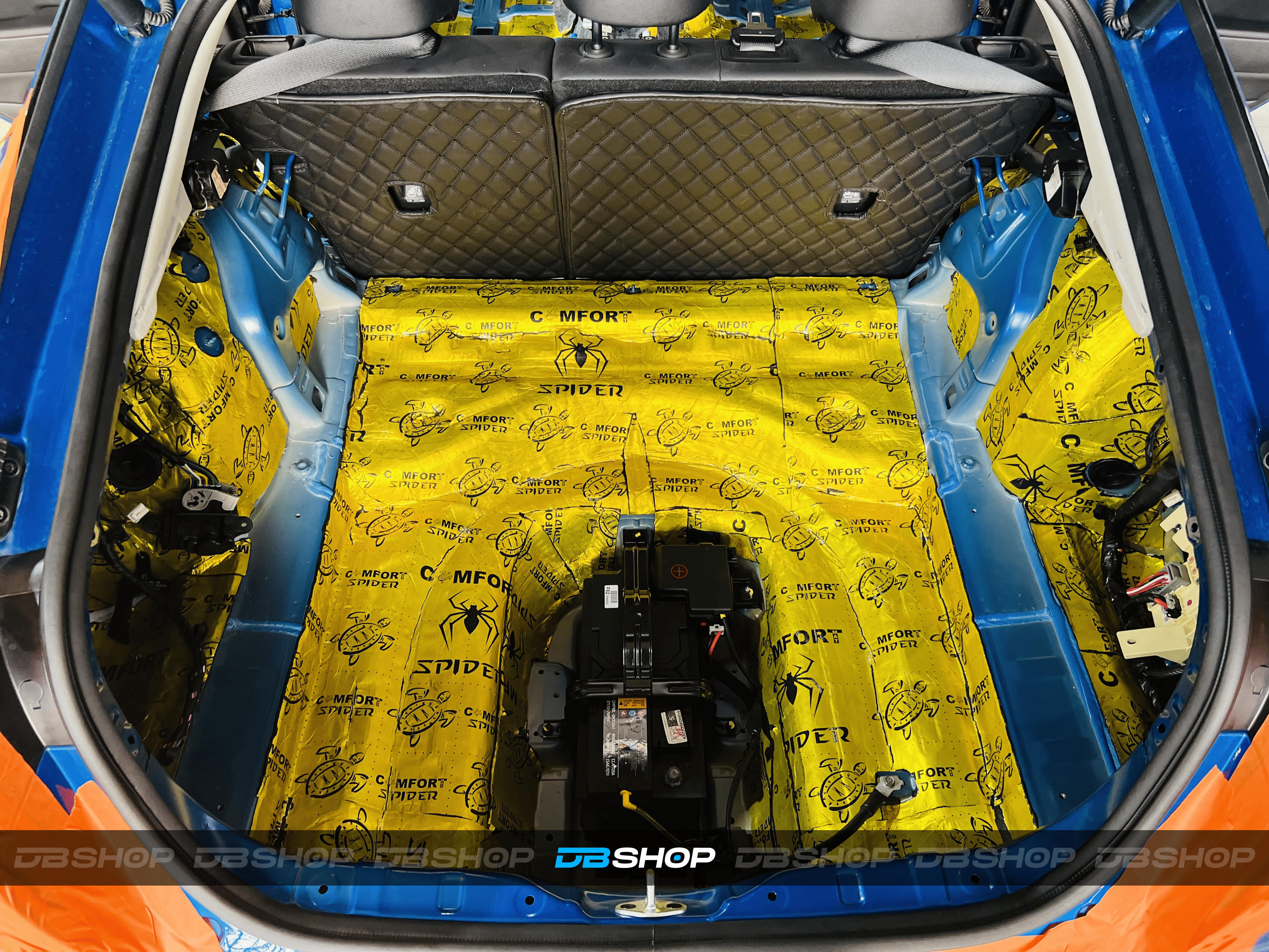 Первым слоем на дно салона и багажник нанесли виброизоляцию Comfort Mat Spider. На снимке виден готовый слой Spider, плотно наклеенный на поверхности, обеспечивающий прочную основу.