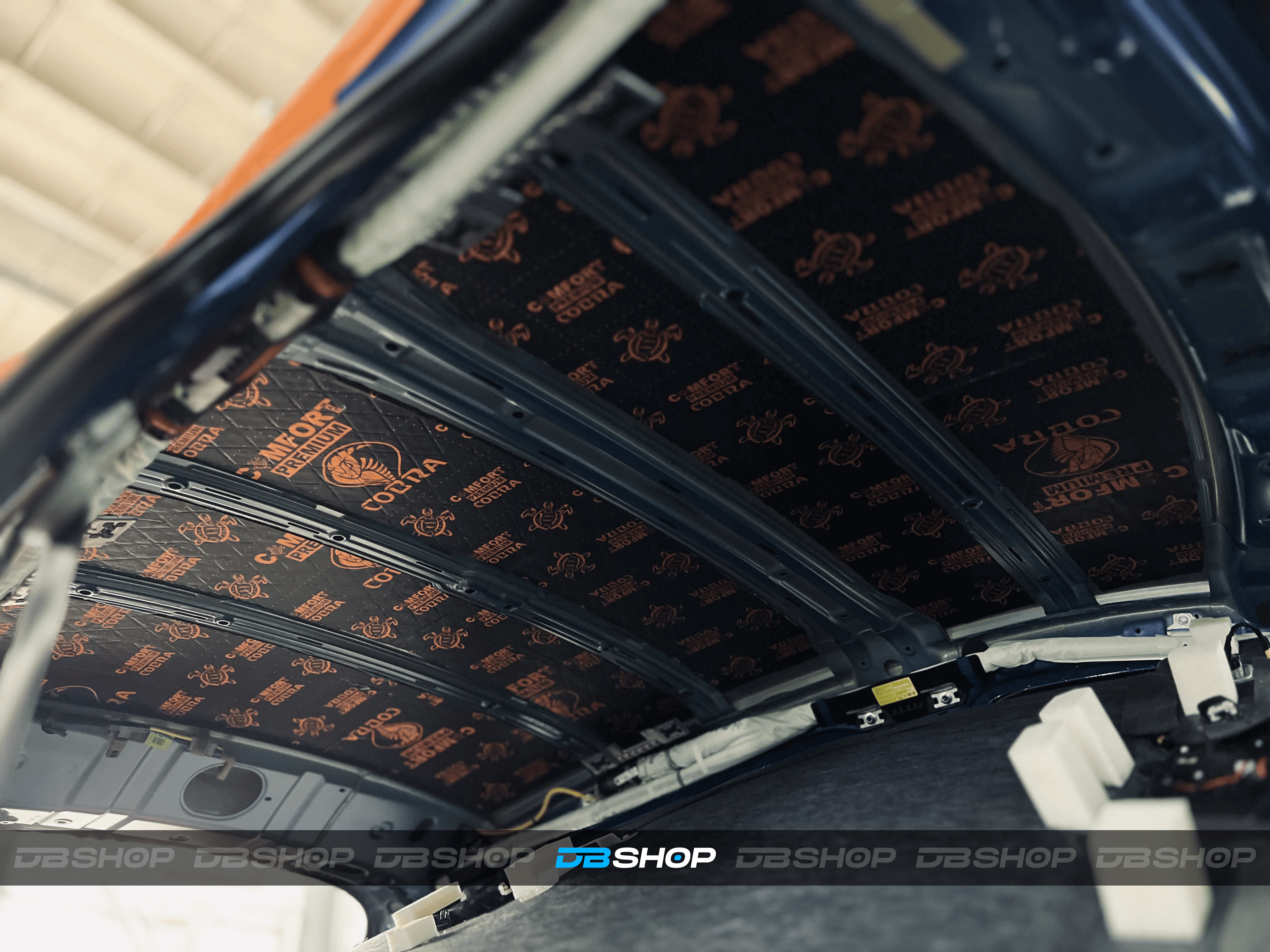 Первым слоем на крышу нанесли виброизоляцию Comfort Mat Cobra. Инновационный шумоизолирующий материал толщиной 2,3 мм. Относится к премиальной серии, обладает улучшенным КМП. Отличается небольшим весом.