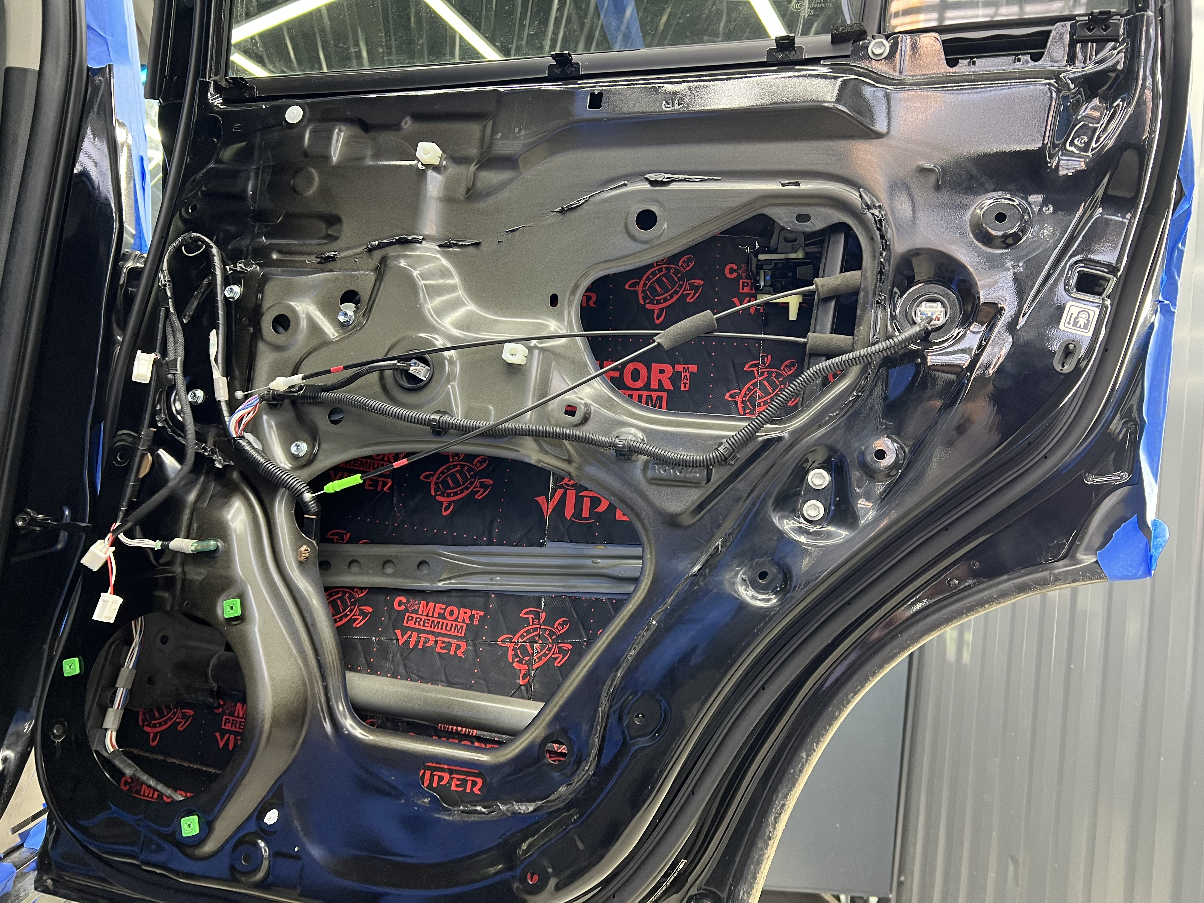 Первым слоем на двери нанесли Виброизоляцию Comfort Mat Dark Viper.